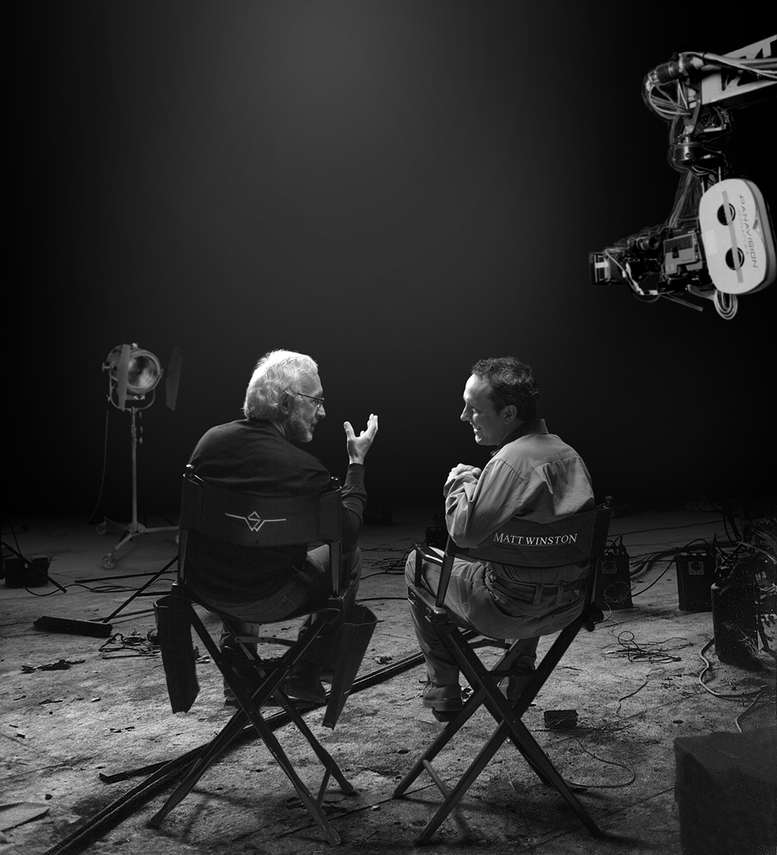 This photo of Stan Winston and son Matt was originally published in Harper's Bazaar magazine in 2001. Stan gave me his input on what he had in mind, which was basically a shot of him and Matt chatting - kinda like we are looking in on a private moment. I came up with the idea of having the two of them on a movie set, in directors chairs. the problem was that we had to shoot this in a small photo studio at work so I knew I would have to do a ton of Photoshop fixing. Assisted by photographer Chuck Zlotnick, we set up the lighting to fit the image in my mind and the rest was up to me. The final Photoshop file consisted of 18 layers of all sorts of digital manipulation.